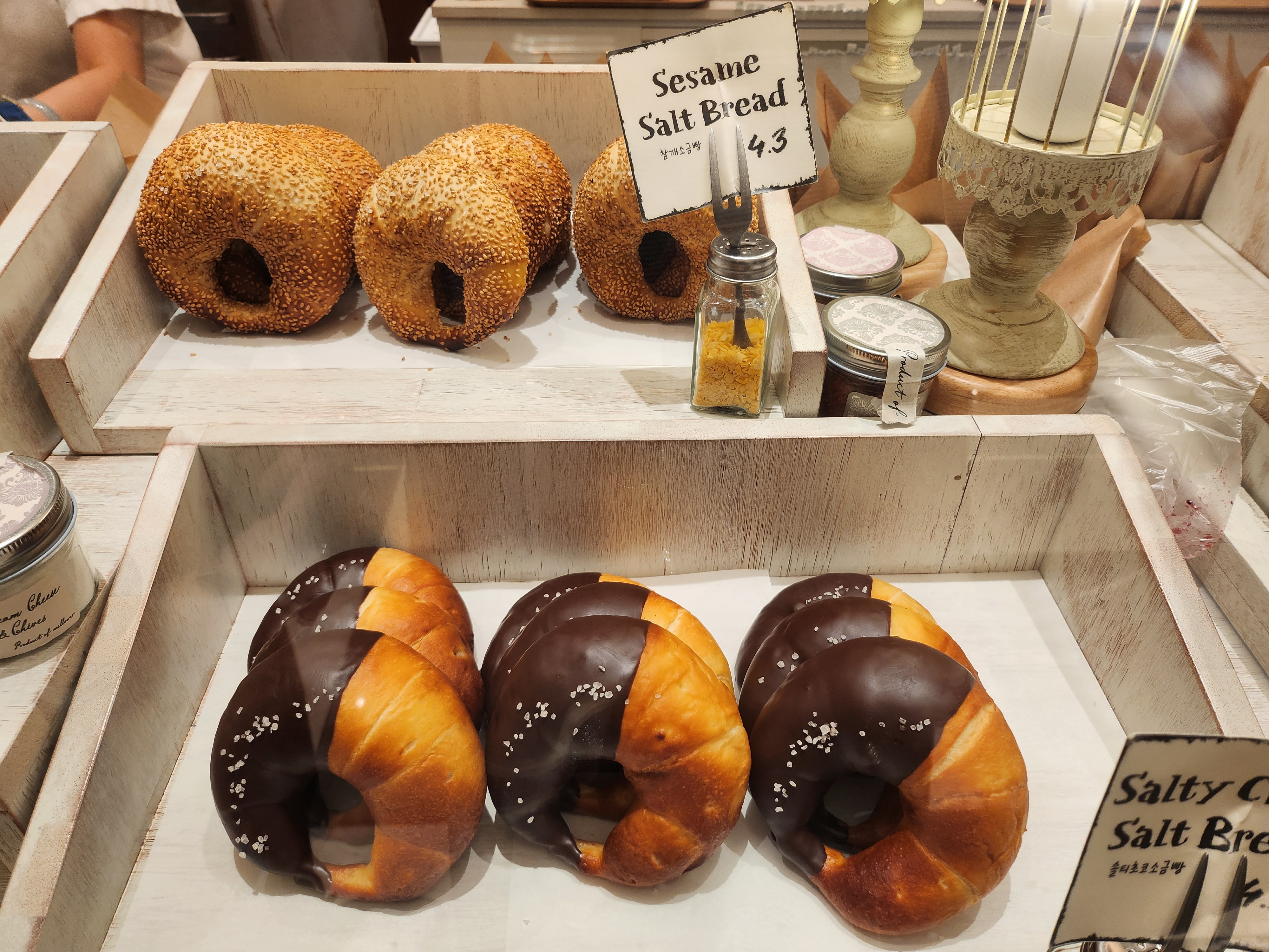 1인당 4개까지 구매 가능하지만, 소금빵의 종류가 4종류가 넘으니 어떤 맛을 고를지 고민하다 기본 소금빵 2개, 바질 소금빵, 블루베리 소금빵으로 픽!!