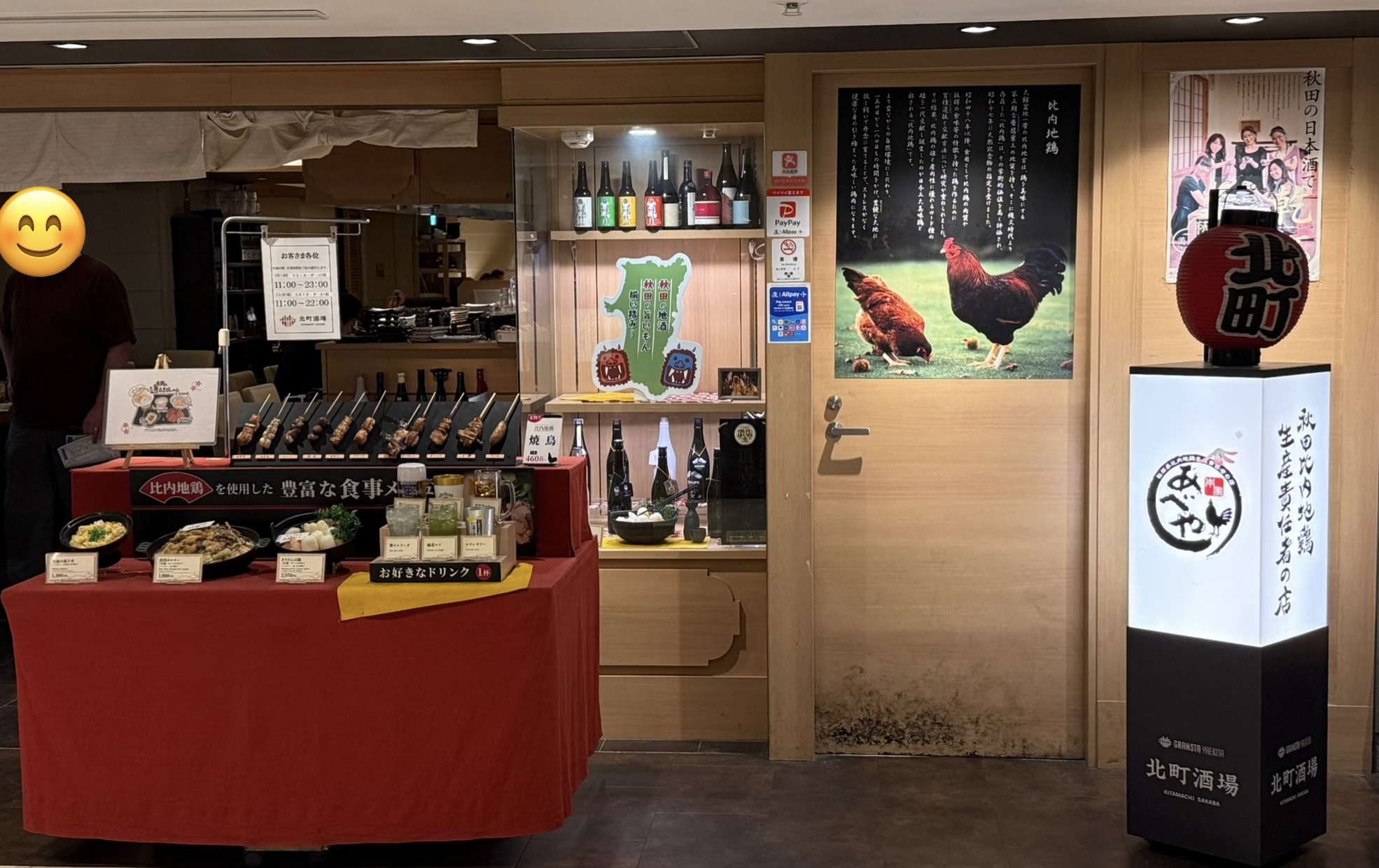 도쿄역 그랑스타 야에키타 2층 키타마치 사카바에 있는 혼케 아베야. 아키타현 닭을 사용한 닭 전문 요리 주점으로, 아키타현 사케도 함께 판매하고 있다.
